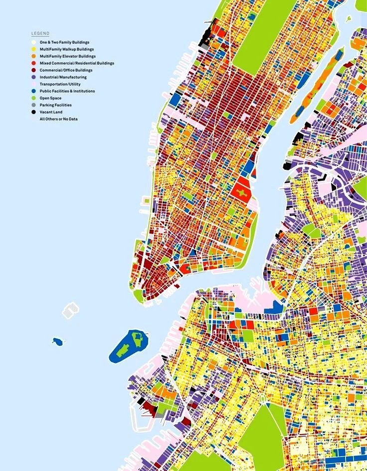 An example of this is the existing land use plan, by parcel, for Manhattan. This plan is a clear and compelling representation of a de-centralized (organic) growth pattern in terms of variation of use and variation of building form. It's almost impossible to walk down any street on the island and think that vast areas were driven by one hand, with one overarching imposition of style, use and execution. It was put together incrementally, against the backdrop of small twenty-five foot wide parcels over two centuries. It is wholly organic in operation, but it is also wholly rigid in its plan as an orthogonal framework. Clearly these two ideas are not mutually exclusive. A city can be both a grid and at the same time organic.